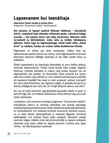 Kui tahame, et lapsed saaksid liikluses hakkama – kannaksid kiivrit, vaataksid teed ületades mõlemale poole, näitaksid käega suunda -, siis peame viima nad välja harjutama. Näitame neile turvaliselt ja läbimõeldult, mida teha ja millele tähelepanu pöörata. Sama lugu on digimaailmaga: lastel tuleb võtta „käest kinni“ ja näidata, kuidas on arukas selles keskkonnas liikuda.