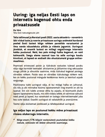 Telia tellimusel ja Norstati poolt 2022. aasta oktoobris - novembris läbi viidud laste ja noorte privaatsuse uuringu andmetel kardavad pooled Eesti lastest kõige rohkem paroolide varastamist ja ilma nende nõusolekuta piltide ja videote jagamist. Uuringust järeldub, et enamik lastest on millegi negatiivsega internetis kokku puutunud. Neid, kes pole midagi halba kogenud, on vaid kolmandik. Seega oleme saanud taas ka selle uuringu kaudu kinnitust, et lapsed on endiselt üks ohustatumaid gruppe online- maailmas.