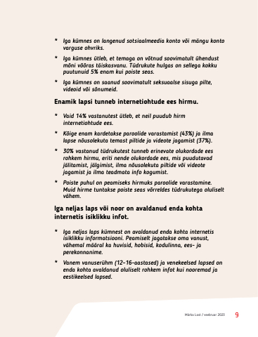 * Iga neljas laps kümnest on avaldanud enda kohta internetis isiklikku informatsiooni. Peamiselt jagatakse oma vanust, vähemal määral ka huvisid, hobisid, kodulinna, ees- ja perekonnanime.